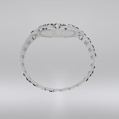At just 0.24 inches thick, the steel case is a one-piece monoblock design that integrates not only the bezel (while foregoing a caseback) but also the entire deployant mechanism. The former provides only three points for water ingress into the watch vs. the traditional five+ ingress points while the latter frees the wearer from the protruding clasp systems found on most all other watches.