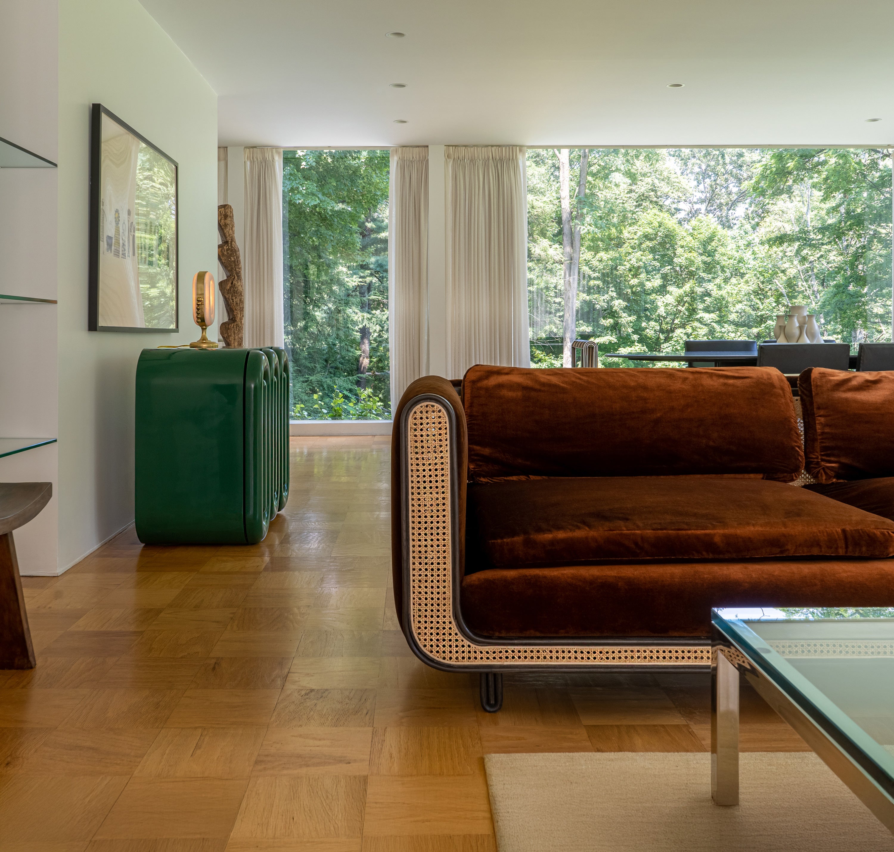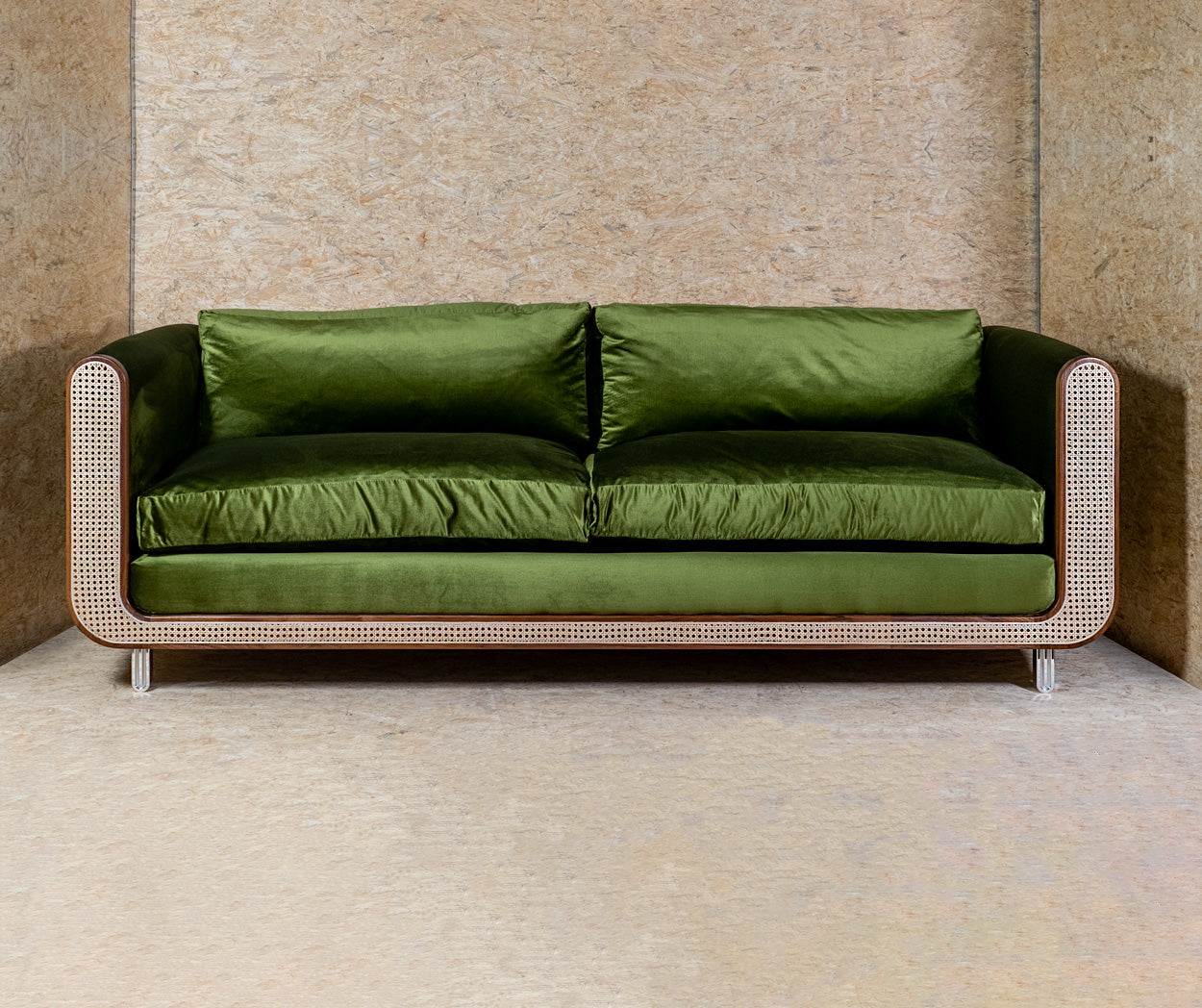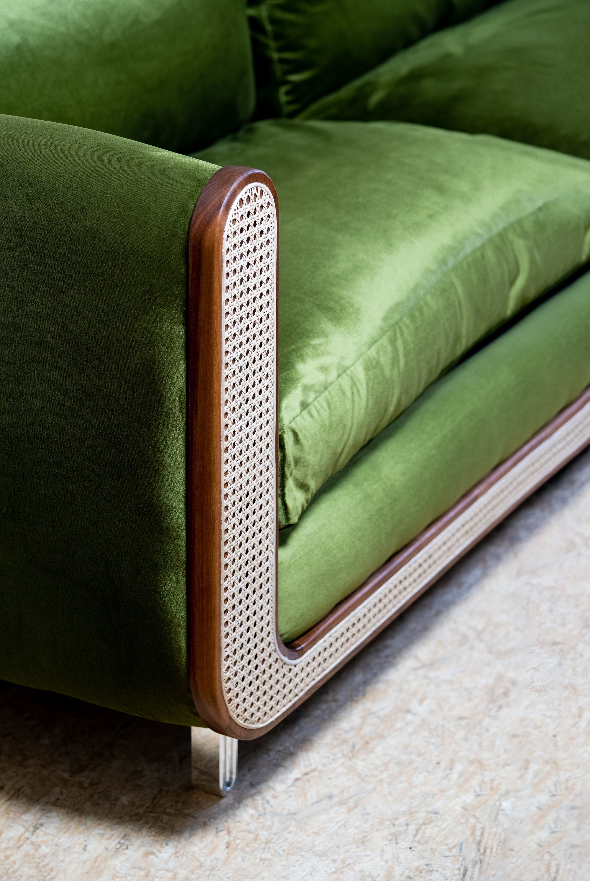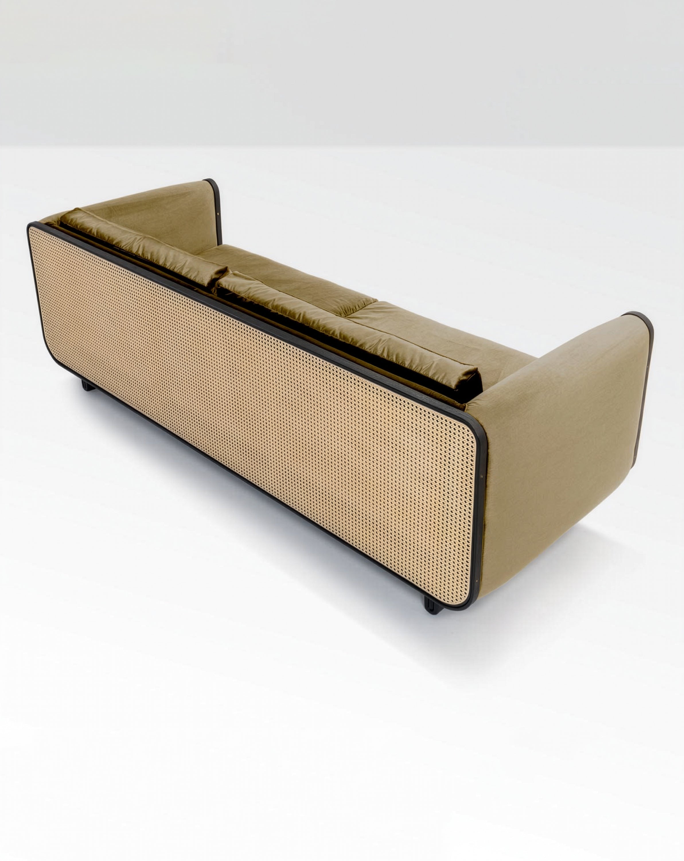 The Nº105 Couch is composed of a natural cane sofa back, seat back and face which allows air and light to pass through the seat back and arms. The sofa frame is constructed from Ash hardwood with 8-way hand-tied coil springs while hardwood trim wraps the front and back profile. Manufactured to order in Manhattan. Contact sales for current lead-time.