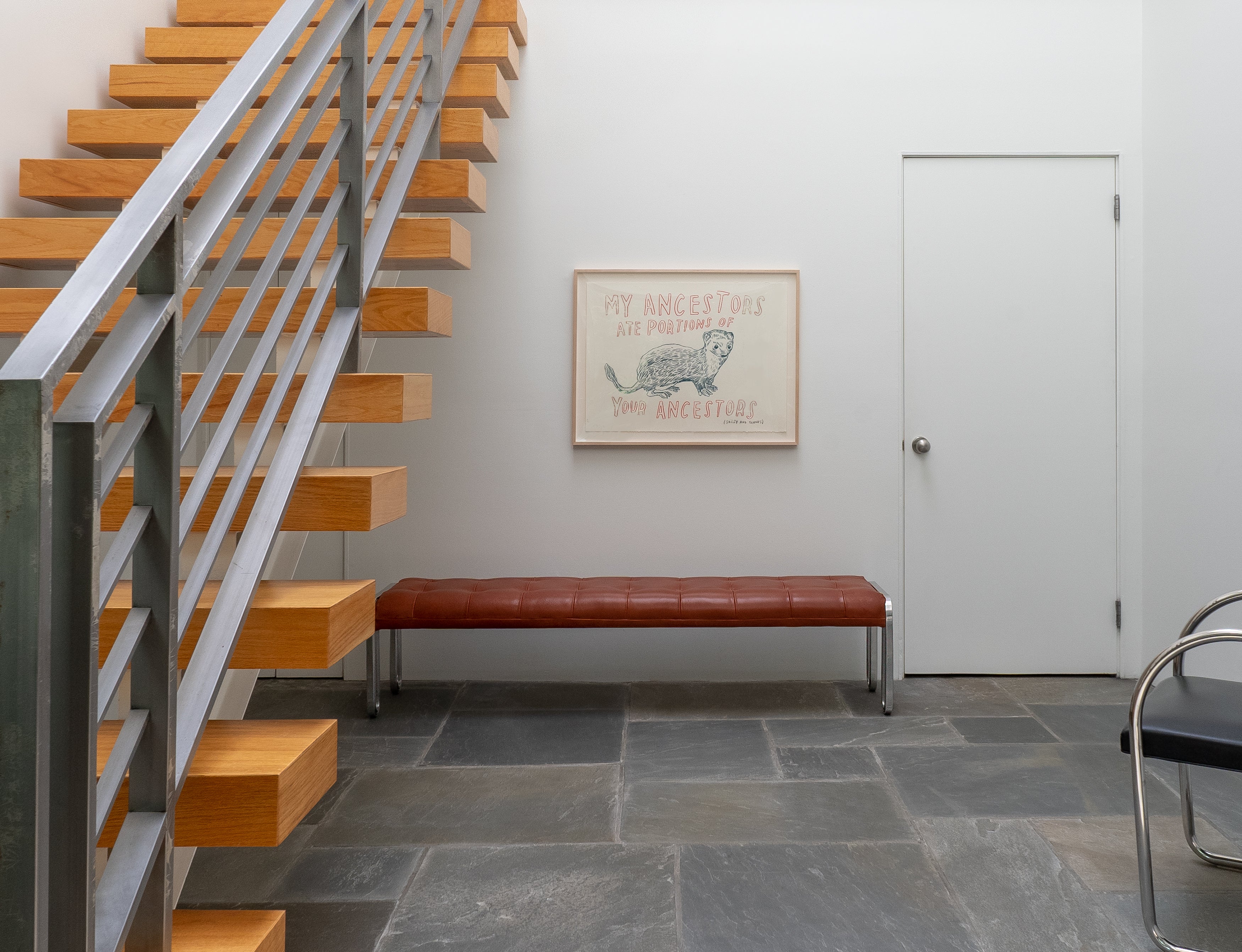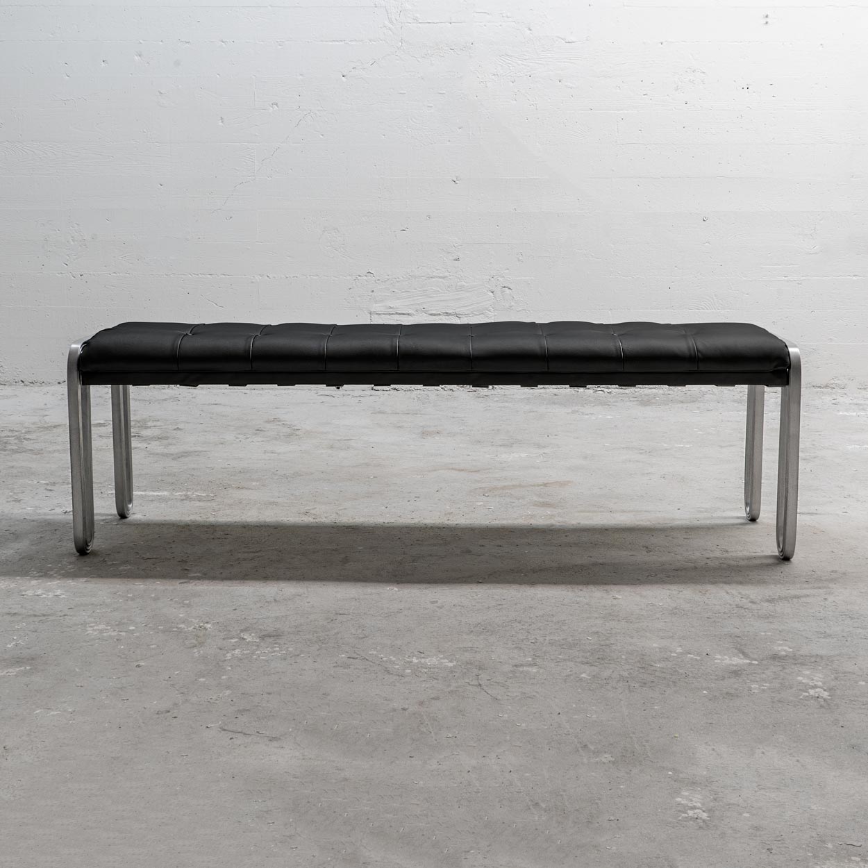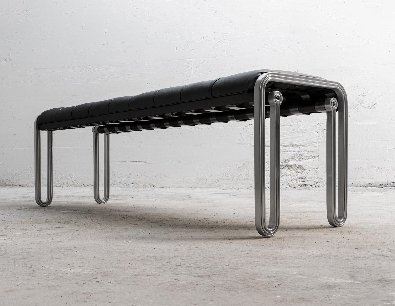 The Nº141 Vestibule Bench is composed of two aluminum side frames interconnected with leather-wrapped rods at the terminus of their legs and a leather tufted seat. Manufactured to order in Manhattan. Contact sales for current lead-time.