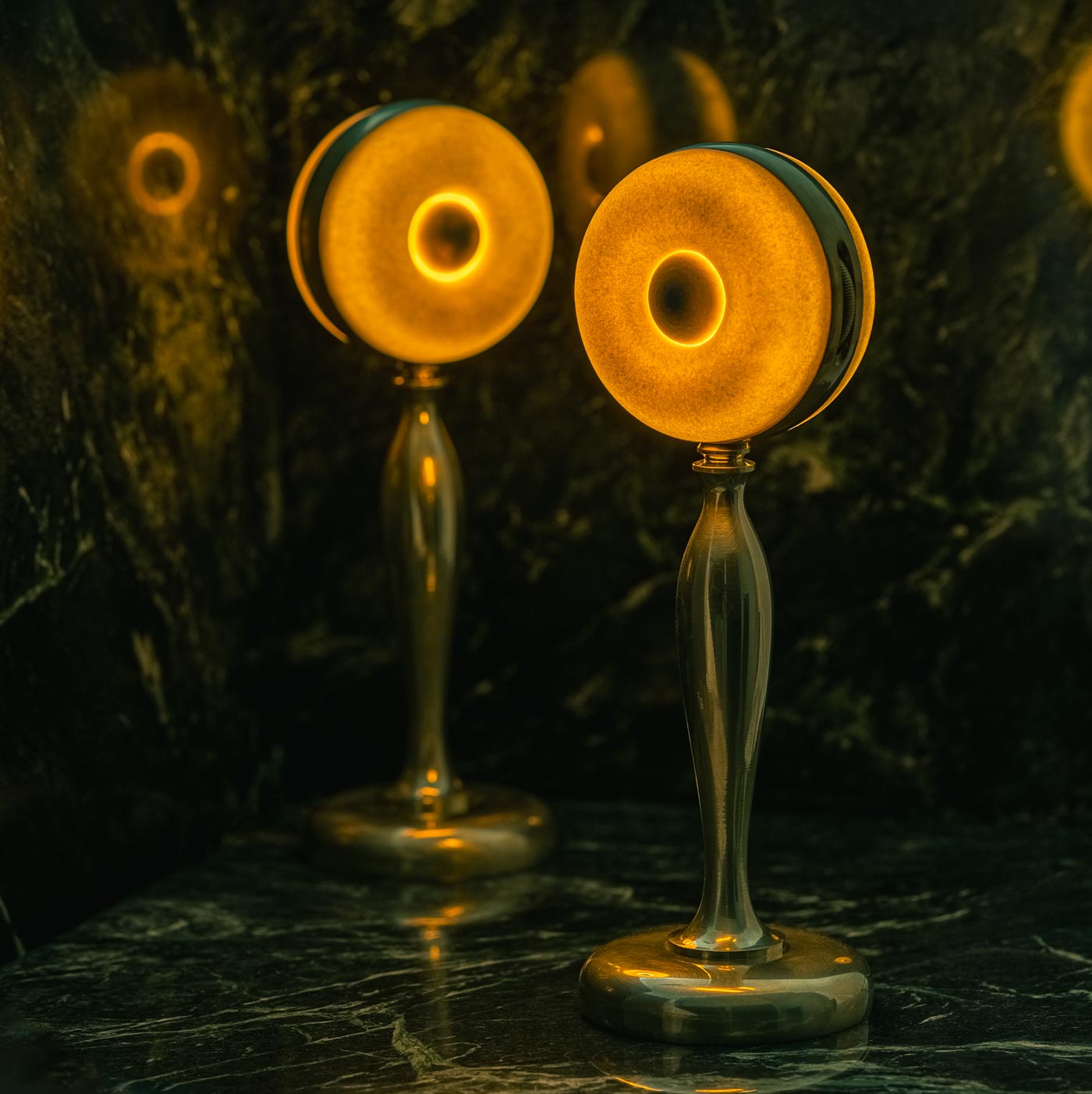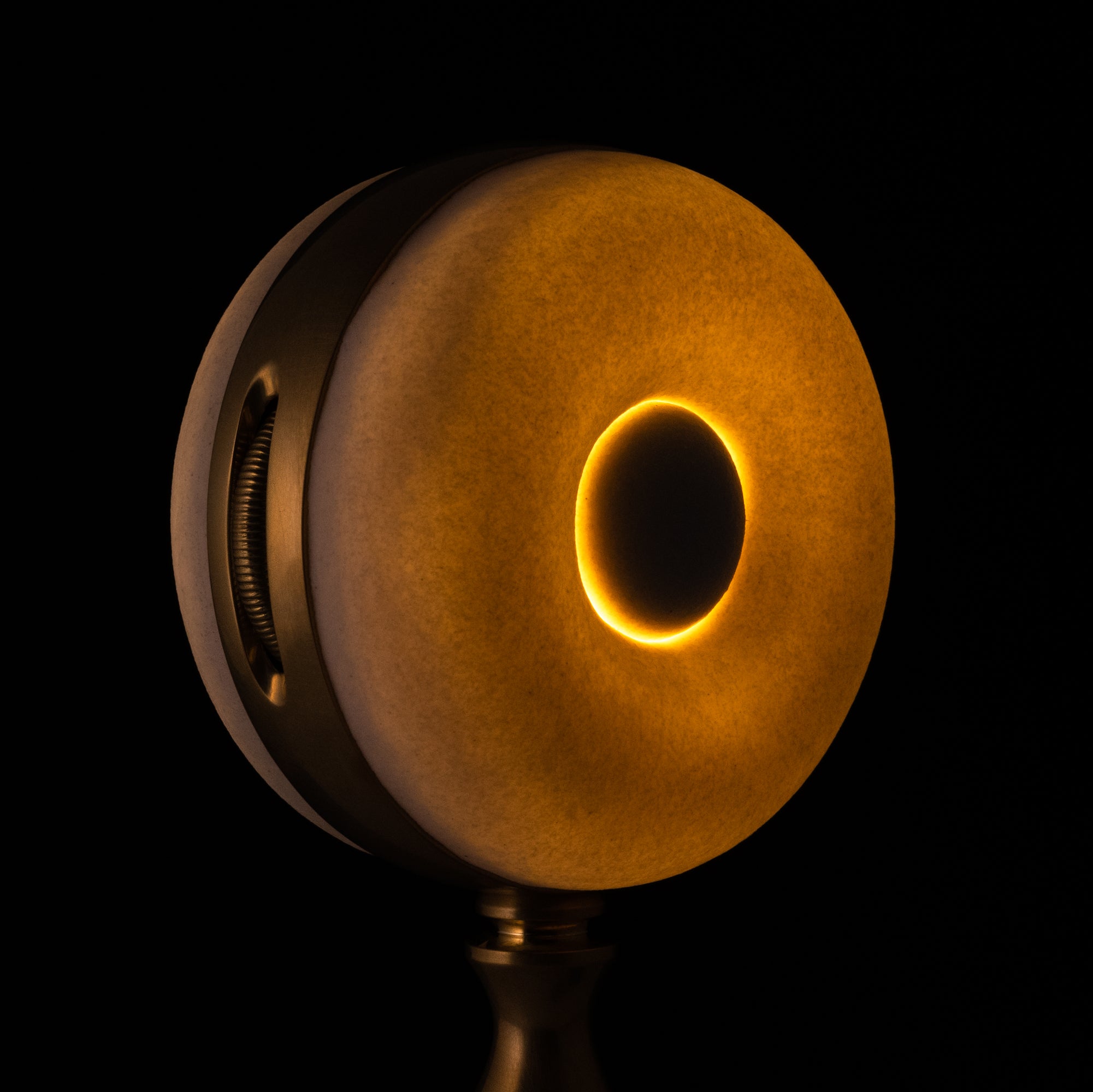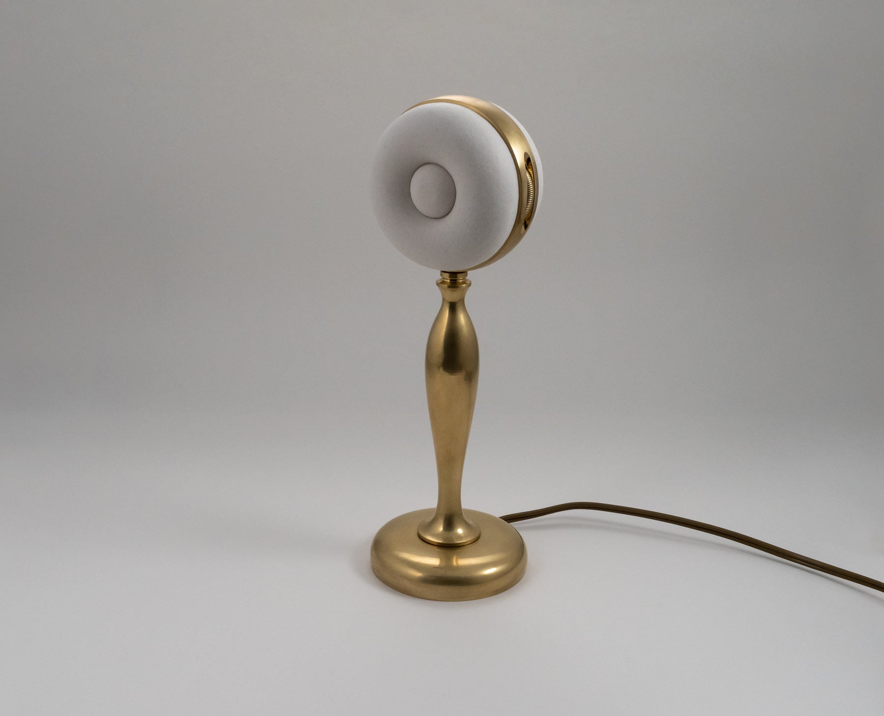 The Nº156 Petite Salesman's Sample Lamp is constructed from a solid brass frame, porcelain slip cast lenses, exhibition thumbwheel control and is illuminated by a light-emitting diode. Only 18 will ever be produced and each lamp is numbered. Manufactured to order in Manhattan. Contact sales for current lead-time.
