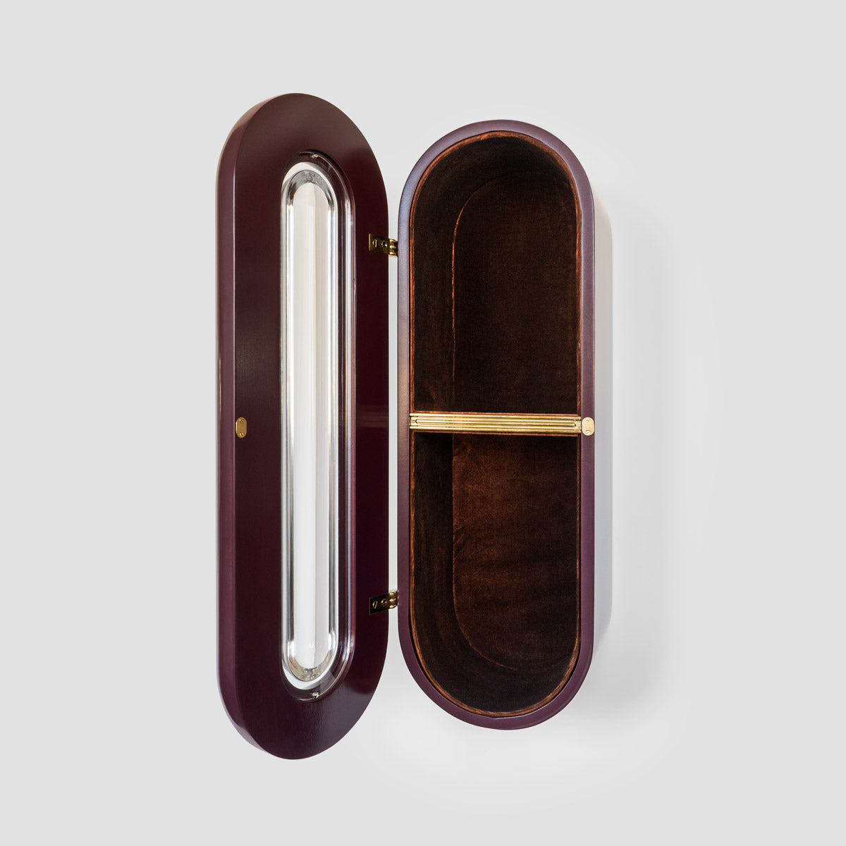 The Nº186 Petite Vitrine is a wall-mounted display cabinet with a trifocal viewing lens mounted within a single domus door. Manufactured to order in Manhattan. Contact sales for current lead-time.