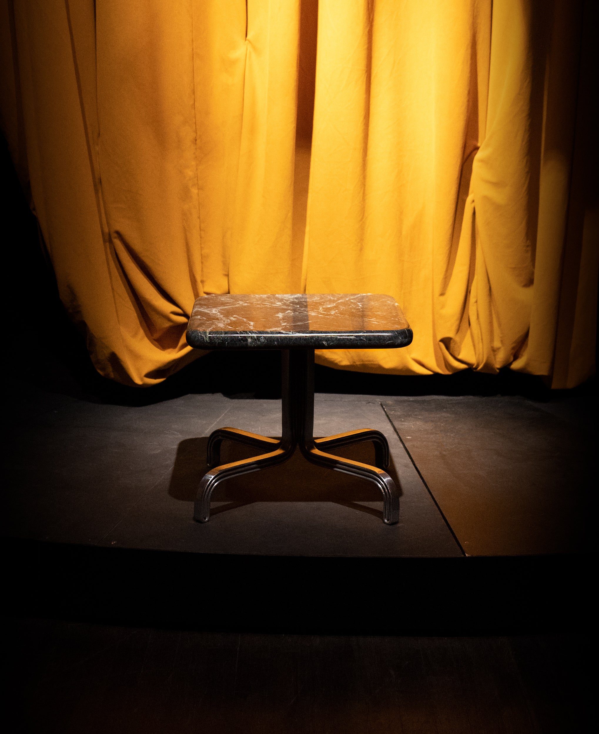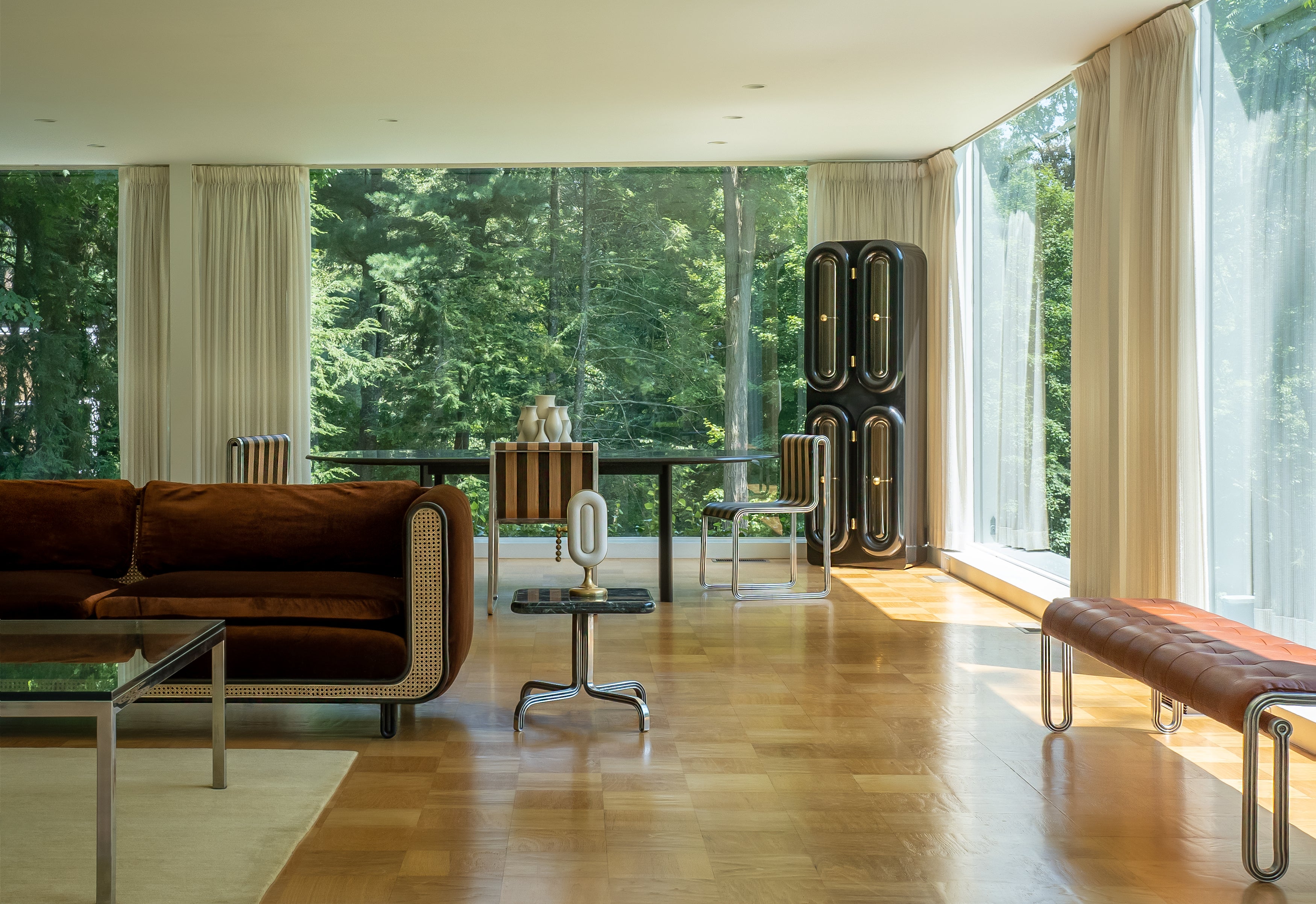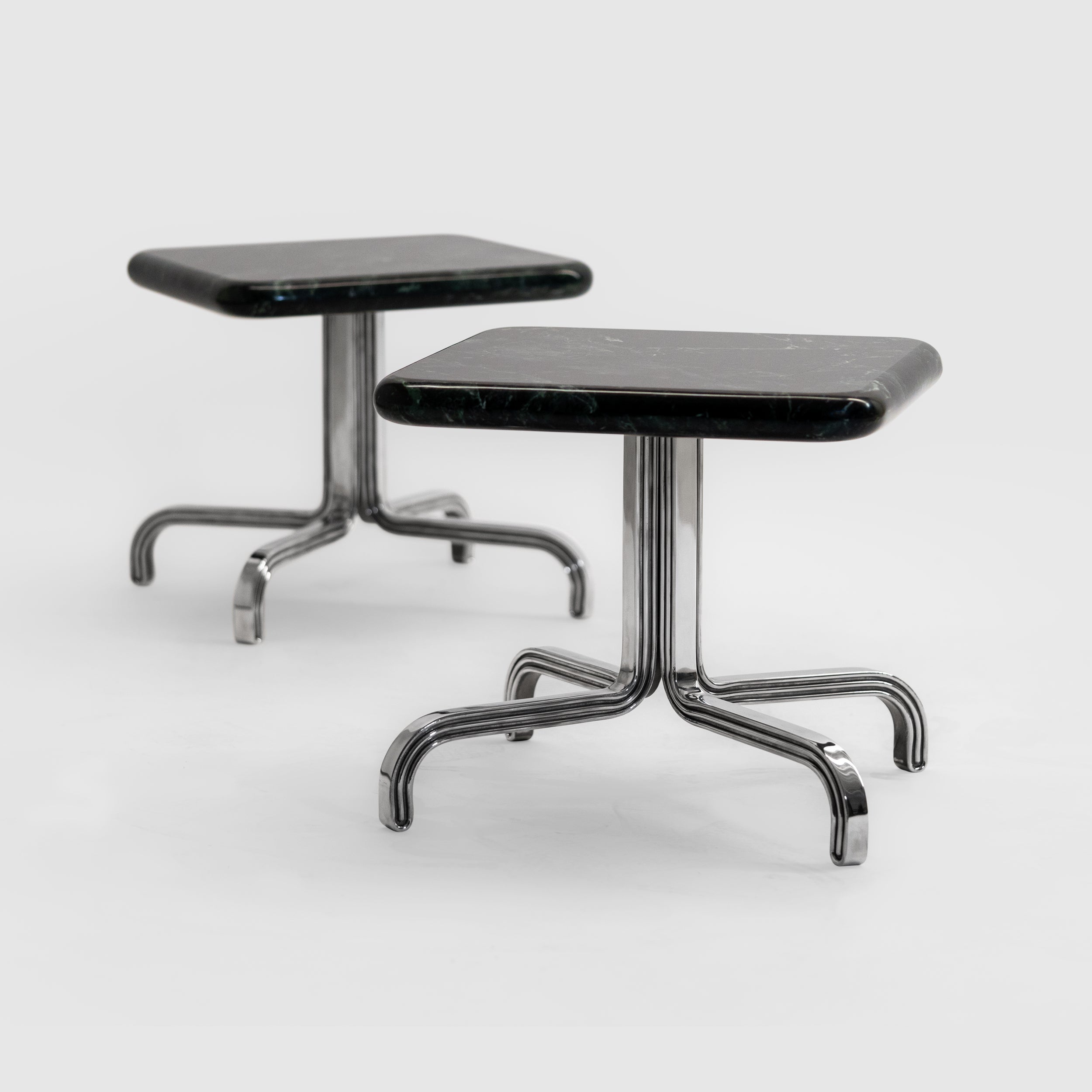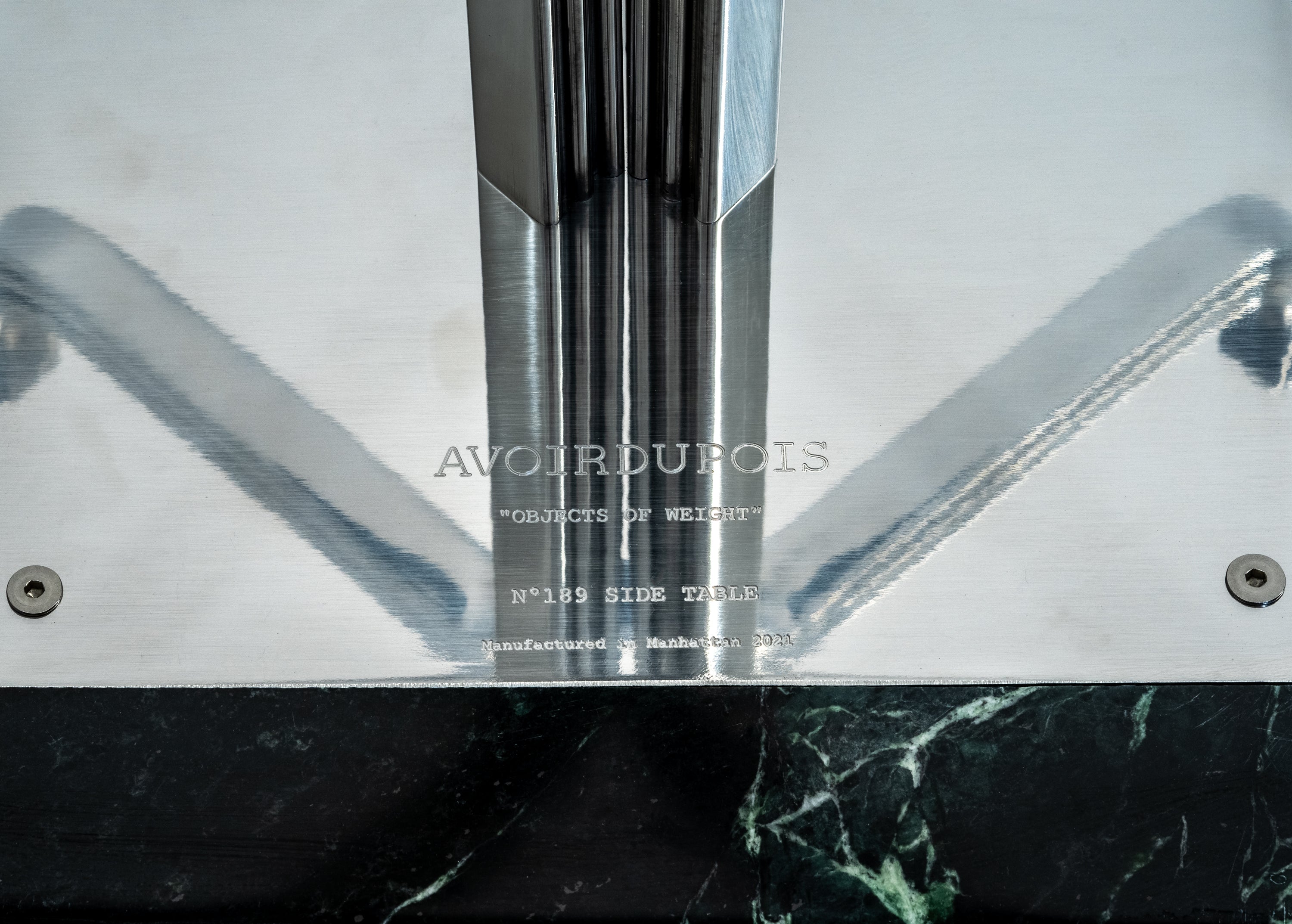 The Nº189 Side Table is comprised of four metal legs bending sharply into one another to create a vertical repeating motif leading to a cushion-edged top surface. Manufactured to order in Manhattan. Contact sales for current lead-time.